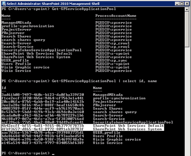 SharePoint has decided to use GUIDs for this Name. Within Central Administration the Application Pools are displayed using a SharePoint only property – Name, which is actually a Display Name (e.g. SharePoint Web Services Default).