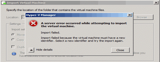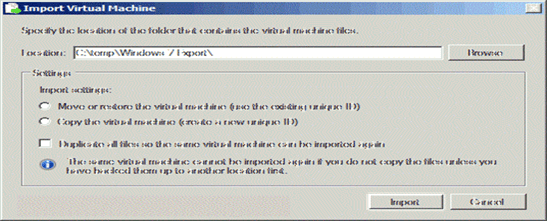 In the window that opens we have two radio buttons and a check box. The first radio button, Move or restore the virtual machine (use the existing unique ID) is going to import the virtual machine and preserve its ID’s. This option is used when importing to a different Hyper-V server. If you import a virtual machine, and on the same Hyper-V server that ID already exists you will get an error message, and the import process fails.
