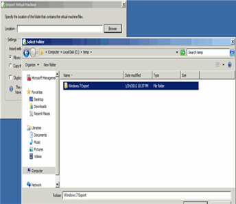 The second radio button, Copy the virtual machine (create a new unique ID), like the name implies, it will create a new ID for the virtual machine you are importing. This is used when you use the same Hyper-V host to export and import virtual machines, like in our case. The check box is there if you want to import the same virtual machine for more than one time, without going through the export process again. Since we are using the same Hyper-V host to import the virtual machine, and another one (the reference machine) exists with the same ID, select the second radio button. Now click Browse and select the exported virtual machine folder, then hit Import. I changed the folder name because this is how I’m going to call my virtual machine in the Hyper-V console.