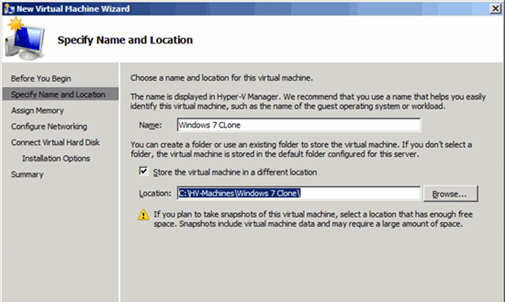 Open Hyper-V manager and create a new virtual machine from the Actions pane. Give the virtual machine a name, and I recommend you name the virtual machine after the folder we just created “Windows 7 Clone”. It will be much easier when troubleshooting. Now choose to store the virtual machine in the folder “Windows 7 Clone”. This is only if you want to have the configuration files and the virtual disk in the same folder.