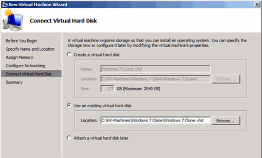 Continue the wizard until you reach the Connect Virtual Hard Disk page. Here instead of creating a new virtual disk we will go with the second option and use an existing virtual disk. Click the Browse button and select the virtual disk we just copied in the “Windows 7 Clone” folder.