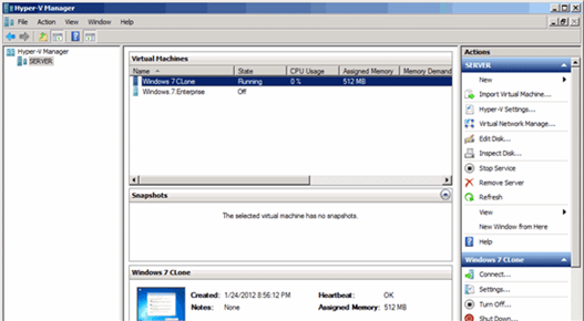 As you know Hyper-V does not have an option to clone virtual machines, except when you use SCVMM. Because of this many administrator need to use tricks so they don’t have to install and configure a new virtual machine from scratch every time they need a copy of Windows 7, or any other operating system. In this guide I’m going to show you two of the most popular ones, and they free. For this lab I have a Hyper-V server running on Windows Server 2008 R2 SP1, and a Windows 7 machine (reference machine) for cloning calledWindows.7.Enterprise.