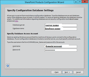 SharePoint Setup user Account used to run SharePoint setup and configuration wizard (admin on SP server and must be granted SQL server log on and member of the following Roles security admin and DB creator ) (s-sql) replaced with spservice(will create all DBs