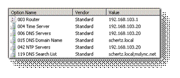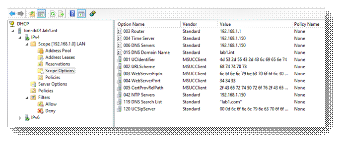 At this point the Scope Options (which display both inherited Server Options and Scope-level options) should display at least the following items: 003 Router, 004 Time Server, 006 DNS Servers, 015 DNS Domain Name, 119 DNS Search List. Additional items may be included which are specific to your existing deployment and are not utilized by Lync.