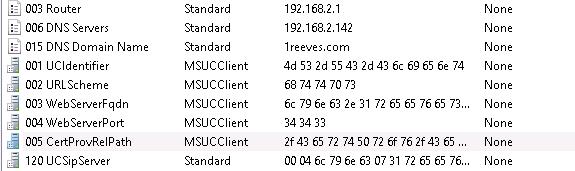 This complete setup of the options for identifier (001), URL Scheme (002),WebServerFqdn (003) , WebServerPort (004), CertProvREIPath (005), DNS search list (119), UC sip server (120). Time Server (004) and NTP Server (042). If you don’t have option 3,6, and 15 add router, DNS servers and DNS domain Name by using the configure option