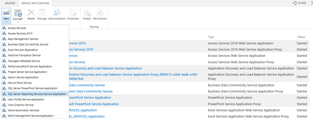 - SharePoint 2010 Central Administration -> “Application Management” -> “Manage Service Applications” ->”New” menu