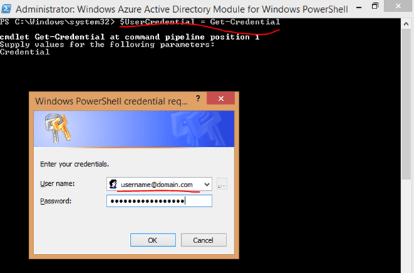 In the Windows PowerShell Credential Request dialog box, type your Office 365 work or school account user name and password, and then click OK.