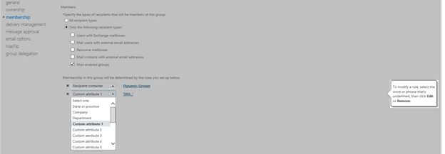 When creating dynamic distribution groups, e-mail address policies, or address lists, you don’t need to use the RecipeintFilter parameter to specify custom attributes. You can use theConditionalCustomAttribute1 to ConditionalCustomAttribute15 parameters instead. You can create a dynamic distribution group based on the recipients whose CustomAttribute1 is set to SalesOU, as shown in this example.