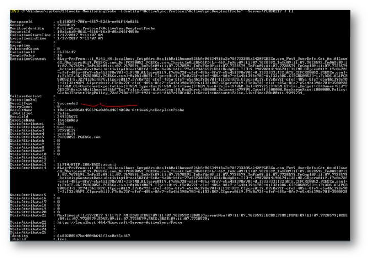Invoke-MonitoringProbe -Identity:”ActiveSync.Protocol\ActiveSyncDeepTestProbe” -Server:servername | fl
