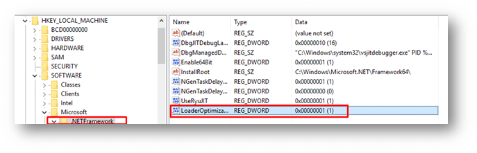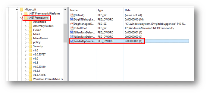 HKEY_LOCAL_MACHINE\SOFTWARE\Wow6432Node\Microsoft\.NETFramework‘, create a new ‘DWORD (32-bit) Value’ named “LoaderOptimization” with a value 1 (either in decimal or hexadecimal as they are the same).