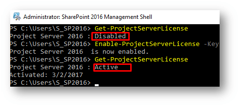 (If you are not sure if Project Server 2016 has already been enabled, use the Get-ProjectServerLicense cmdlet to check.)