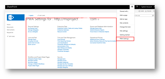 There are two options for deploying Project Web App, either you can create a Project Web App site as the top level of a new site collection, or you can add a Project Web App site to an existing site collection.