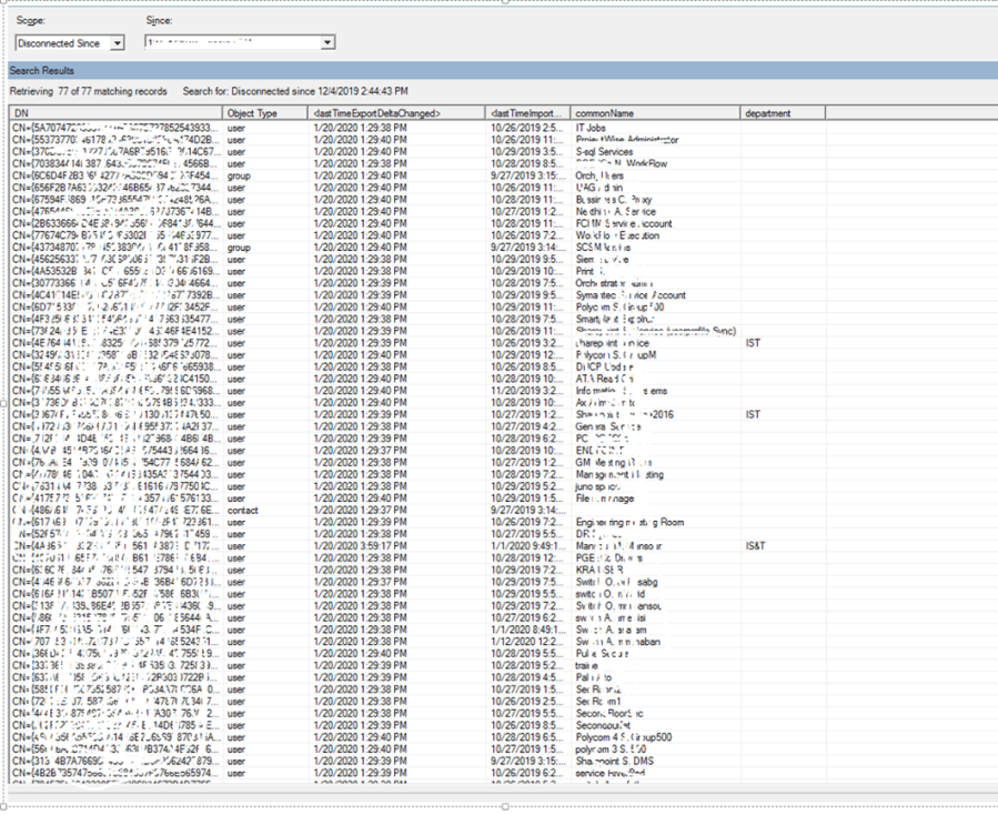 - In the pop-up under Scope, select Disconnected Since and pick a time in the past. Click Search. This page provides a view of all objects about to be deleted. By clicking each item, you can get additional information about the object. You can also click Column Setting to add additional attributes to be visible in the grid.