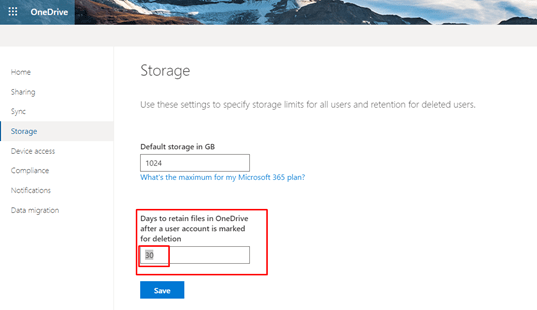 Enter the number of days you want to keep the OneDrive files in the Days to retain files in OneDrive after a user account is marked for deletion box.
