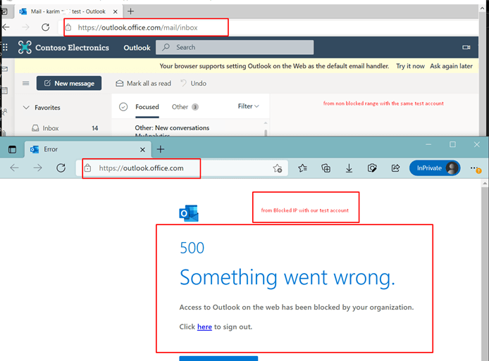 - Test with PowerShell ITadmin and another user from blocked range and allowed ranges