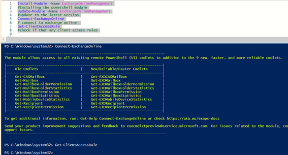 Run the following PowerShell commands to connect to exchange online