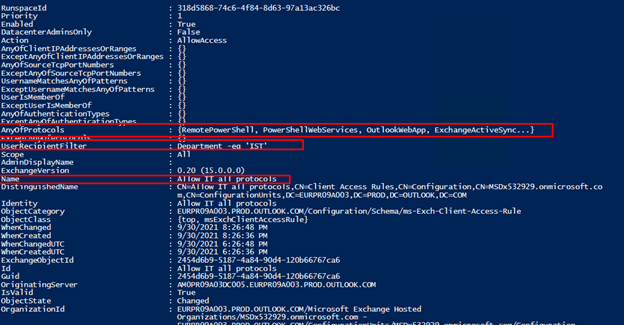 Get-ClientAccessRule -Identity “Allow IT all protocols” | FL
