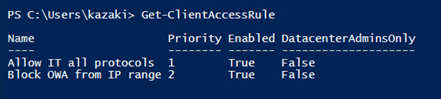 Get-ClientAccessRule -Identity “Block OWA from IP range” | FL