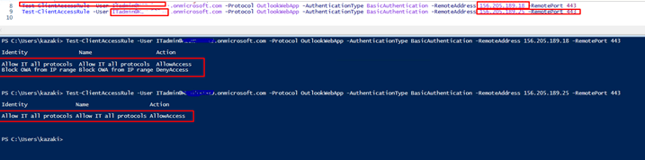 Test-ClientAccessRule -User ITadmin@yourdomain.com -Protocol OutlookWebApp -AuthenticationType BasicAuthentication -RemoteAddress AllowedIP -RemotePort 443