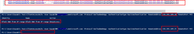 Test-ClientAccessRule -User blockeduser@domain.com -Protocol OutlookWebApp -AuthenticationType BasicAuthentication -RemoteAddress BlockedIP -RemotePort 443