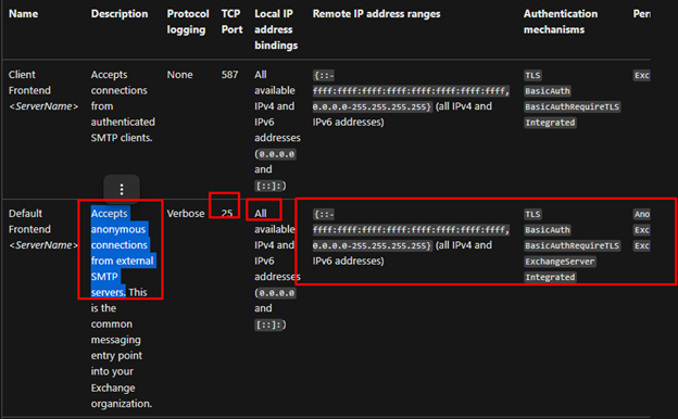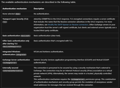 So first it uses port 25 for inbound, accepts anonymous connections from external SMTP, IP ranges to accept from any IPV4 any IPV6, authentication must have the following